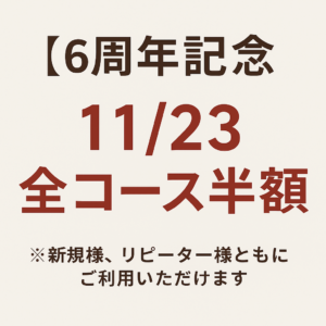 快明整体院は、皆さまのおかげで6周年を迎えることができました。 日頃の感謝を込めて、開業記念日の11月23日は、全コース半額でご提供いたします。